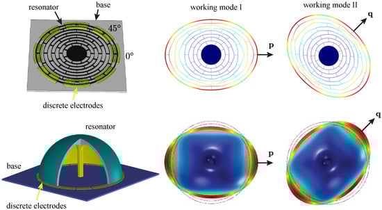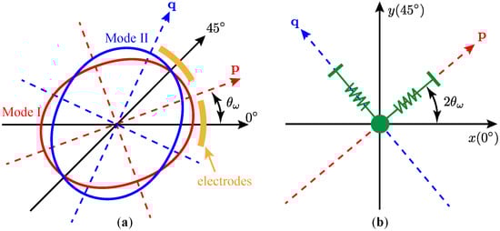 The mode shape with the wave number of , shown in Figure 1 where a micro ring resonator and a micro hemispherical resonator are taken as examples, is commonly implemented as working modes in MEMS axisymmetric gyroscopes. From Figure 1, we can observe that there are two orthogonal modes for the mode shape of . The angle between the principal axes of the working modes is in geometry, along the directions of and .