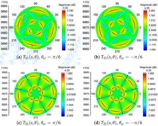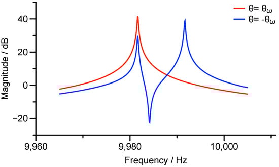 Figure 3 clearly exhibits the changes of the magnitude responses over different forcing angles. In , as shown in Figure 3a,b, the response will experience two peaks and one valley, except in the directions of () where only one peak will occur at the frequency of or . The responses of cross-couplings, in Figure 3c,d, display two resonances in most directions expect in where no couplings occur at all, which can be verified by examining the numerator of Equation (22). Also, the most pronounced difference between and is the valley between the two peaks.