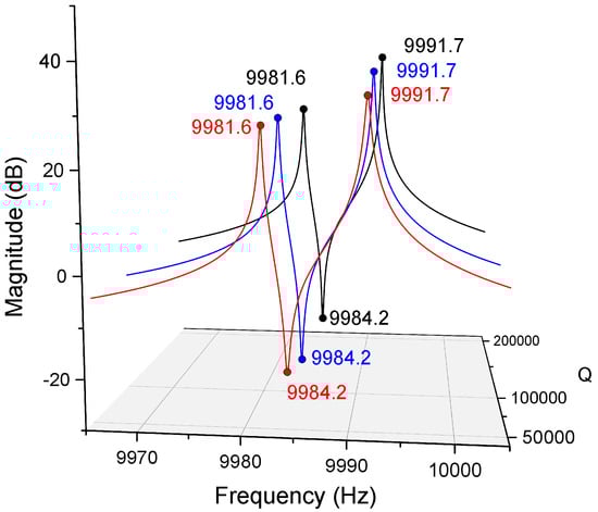 In Equation (23), the errors in damping forces are still ignored because the damping mismatch will not significantly affect the modal frequencies and their directions. Figure 4 manifests the transfer function of with different damping mismatches. The Q-factor of the working mode with the frequency of is fixed as 100,000. The corresponding poles and zeros of the magnitude-frequency responses almost stay at the same frequencies while the Q-factor of the frequency of changes from 50,000 to 200,000.