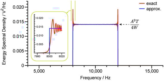 Figure 7 demonstrates the approximated energy spectral density of the chirp signal from Equation (34) and the exact curve from the numerical calculation. Except the oscillatory ripples near the edge frequencies, Equation (34) can retain the essential properties of the chirp signal’s energy spectral density.