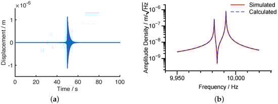 Figure 8 presents the simulated response to the chirp excitation in the time domain and in the frequency domain, respectively. The numerically simulated amplitude spectral density and that calculated from Equation (36) are also compared in Figure 8b, showing the full consistence.