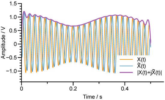 Figure 9 also shows the Hilbert transform of and the magnitude of the analytic signal , which exactly is the envelope of . Equation (42) implies that the fundamental frequency of the signal envelope reflects the modal frequency split, . Similarly, the envelope of can be expressed by