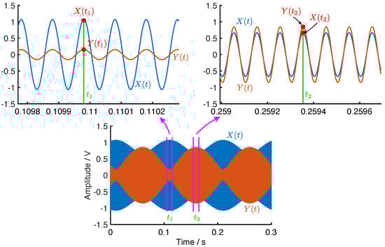 The constraints described by Equations (44)–(47) are sufficient for resonators with extremely high Q-factor, whose time constant of the ring-down is large enough to perform the above analysis. However, if the ring-down of the resonators decays notably, the peak and the valley values of the beats are not easy to maintain, as shown in Figure 11.