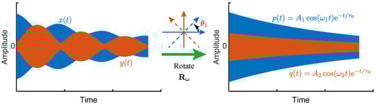 Similar to the method of the frequency sweep, the value of still cannot be figured out by one single constraint. However, by virtue of the obtained , we can rotate the ring-down vibrations along to those along through Equation (2), as illustrated in Figure 12.
