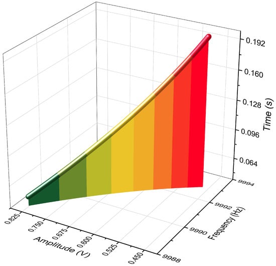 Equation (36) indicates that, if ignoring the ripples at the edge frequencies, the amplitude spectral density of the chirp-driven resonator’s outcome just gives the curve of the frequency response. It should be noted that the strength of the resultant amplitude spectral density can be adjusted by the chirp input under the law of . On the other hand, the resultant frequency resolution in is inversely proportional to the sweep time T.