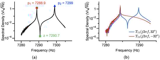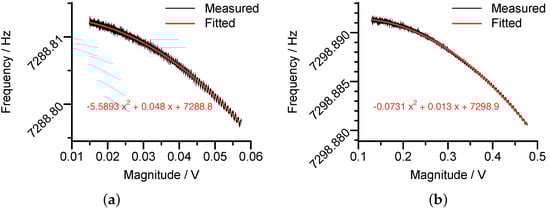The DAC output a chirp signal with the start frequency of 7280 Hz and the end frequency of 7310 Hz at the duration time of 30 s. The analyzer sampled the signals from the chirp-driven resonator at a rate of 204.8 kHz. The resultant amplitude spectral density is presented in Figure 15a, giving that , , and . From Equation (26), we can conclude that .