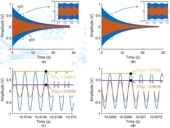 The measured ring-down signals and the peaks and the valleys of the beats. (a) The original signals sampled from XY directions. (b) The signals passed through the bandpass filter. (c) Zooming at the position of the peak of . (d) Zooming at the position of the peak of .