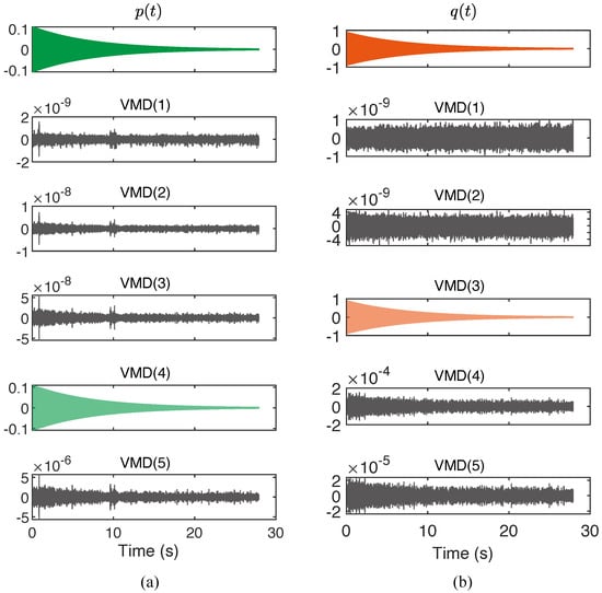 To utilize the method described by Equations (52) and (53), the variational mode decomposition (VMD) was respectively performed to and to verify the property of monocomponent. It can be readily found that, in both and , there was only one VMD component whose amplitude significantly greater than the others, suggesting the Hilbert transform can be effectively applied.