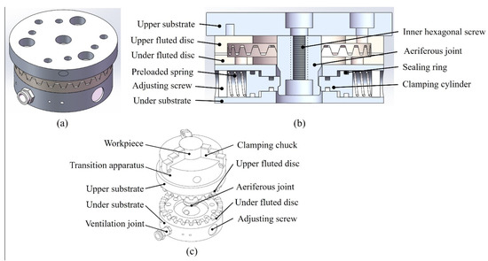 A three-dimensional illustration of the proposed high-precision positioner fixture is shown in Figure 1. A high-precision end-toothed disc was used to achieve the high repeated positioning accuracy and the high stiffness clamping of the positioner fixture was attained through the matching convex–concave structure, as shown in Figure 1b. In addition, the pneumatic clamping method was selected to achieve the advantages of the positioner fixture of a short positioning time and simple operation. The structure diagram of the proposed positioner fixture with the workpiece is shown in Figure 1c and was divided into upper and lower parts. The lower part was composed of the under substrate, under fluted disc, ventilation joint and adjusting screw. The under fluted disc, ventilation joint and adjusting screw were fixed connected to the under substrate. A clamping cylinder and preloaded spring were also installed inside the under substrate, as shown in Figure 1b. The under substrate was connected to the workbench of the machine tool or testing equipment. The upper part was composed of the upper substrate, upper fluted disc, transition apparatus, aeriferous joint and workpiece. The upper fluted disc, transition apparatus and aeriferous joint were fixed connected to the upper substrate. It should be noted that the workpiece was mounted on the upper substrate through the transition apparatus and the shape of the workpiece was determined by the transition apparatus. An inner hexagonal screw was installed inside the upper substrate and was used to connect the upper substrate and the aeriferous joint, as shown in Figure 1b. The operation steps of the proposed positioner fixture were as follows: in the initial state, the aeriferous joint was not ventilated, the spring pushed the clamping cylinder to the center and the clamping cylinder cooperated with the aeriferous joint to complete the clamping under the action of the spring force. At this time, the upper and under fluted gear discs were in a stable meshing state. When the aeriferous joint was ventilated and the air pressure was greater than the spring force, the clamping cylinder moved from inside to outside. At this time, the positioner fixture was in the unloaded state and the upper fluted gear disc part could be removed, as shown in Figure 1c. It should be noted that the positioner fixture needed to be ventilated during the process of removing and putting in the upper fluted gear disc part. In the proposed positioner fixture, the workpiece was completely positioned. It is worth noting that the adjustment of the clamping force applied by the clamping cylinder to the aeriferous joint could be achieved by regulating the adjusting screw. Thus, the proposed structure of the positioner fixture met the requirements of a high repeated positioning accuracy, high stiffness, short positioning time and simple operation.