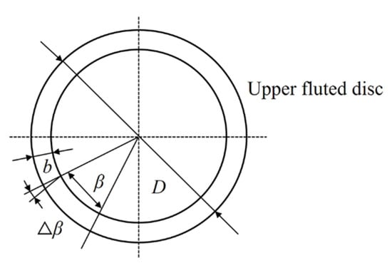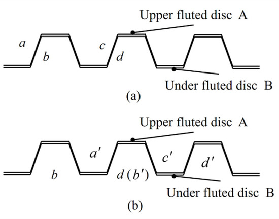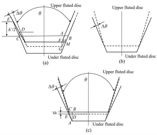 (d) Type 4: The upper fluted disc is standard. The deviation of the actual half-angle of the under fluted disc from the standard half-angle is and it is biased to the outside of the axis, as shown in Figure 4c. In this case, the upper fluted disc moves vertically downwards and . The length of the rotation arc around the axis can then be expressed as: