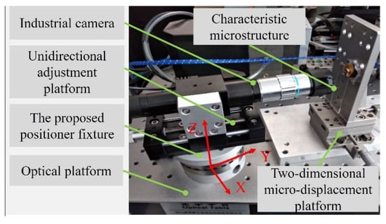 In order to validate the rationality of the configuration of the high-precision positioner fixture and verify the results of the theoretical calculation, a high-precision positioner fixture that met the tolerance requirements was fabricated and a repeated positioning accuracy test of the positioner fixture was performed. Significantly, the test results were affected by the machine tool movement error and tool manufacturing error when the positioning accuracy of the positioner fixture was tested under the cutting state. Therefore, a non-contact test method was used in this experiment. Figure 5 shows the experimental setup of the repeated positioning accuracy test of the proposed positioner fixture. A high-precision industrial camera was fixed on the positioner fixture through a unidirectional adjustment platform and the positioner fixture was fixed on the optical platform. The industrial camera could be moved back and forth through the unidirectional adjustment platform to achieve a precise focusing. A characteristic microstructure sheet was placed on the front end of the industrial camera and it was fixed on the optical platform through a two-dimensional microdisplacement platform. The resolution of the two-dimensional microdisplacement platform in both the x direction and the z direction was 1 μm. The array structure of the characteristic microstructure sheet was 100 μm × 100 μm square grid holes. The machining accuracy of the grid holes was better than 0.1 μm, indicating that the accumulated error caused by the inaccuracies of the grid holes was less than 0.1 μm, which satisfied the requirement of this experiment.