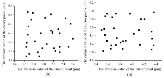 After the measurement experiments of the repeated positioning accuracy of the proposed positioner fixture, experimental images were obtained and the image processing was performed. As shown in Figure 6, image processing software was used to dispose of the collected images. The scale parameter was set to 0.045 μm/pixel according to the resolution of the camera. The coordinate position of the cursor in the image was recorded so that the distance and coordinate values of the cursor relative to the origin could be obtained. In order to reduce random errors and improve the accuracy of the test, the repeated positioning accuracy of the positioner fixture was tested 30 times.