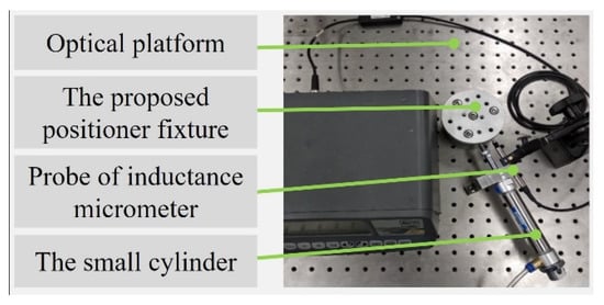 In order to verify that the proposed positioner fixture could maintain a high positioning accuracy under working conditions, it was necessary to conduct a stiffness test on the proposed positioner fixture. The experimental setup of the stiffness measurement is shown in Figure 8. The testing devices mainly included the proposed positioner fixture, an inductance micrometer, a small cylinder and an optical platform. The cylinder was used as a force application device and the applied force value could be continuously changed from 0 to 100 N by precisely adjusting the value of the air pressure. The inductance micrometer selected in this experiment was the TT80 inductance micrometer, which is produced by the Swiss TESA company. The resolution of the inductance micrometer was 0.1 μm, which met the needs of the experiment.