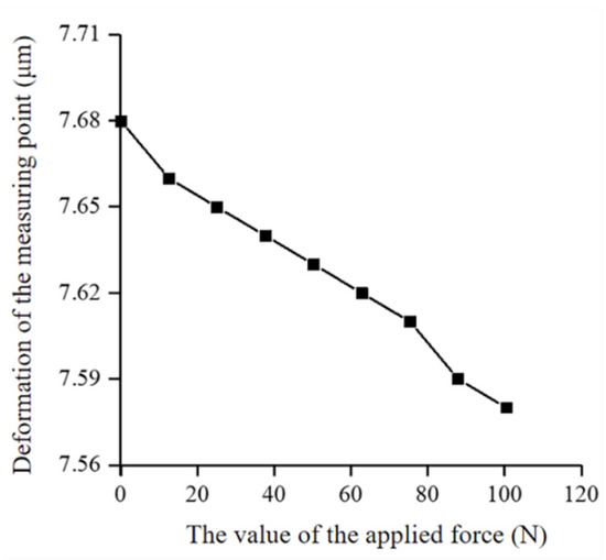 Figure 9 is the numerical curve diagram of the different values of the applied force and displacement of the measured point. The equation of this curve could be written as and the slope of the curve was −0.0009. According to the relationship between the applied force and the displacement, the stiffness of the proposed positioner fixture could be calculated to be 1050.5 N/μm, which was larger than the previous positioner fixture of the same type. It is worth noting that the greater the stiffness of the proposed positioner fixture, the smaller the deformation generated during the machining process, which is beneficial for precision machining. When the measuring head and the direction of the applied force were changed in the horizontal plane, the stiffness value of the positioner fixture was almost unchanged. When the measuring head and the direction of the applied force were changed along the z direction, the test results showed that the stiffness of the positioner fixture in the vertical direction was much greater than in the horizontal direction. The test results showed that the proposed positioner fixture had a higher stiffness. In summary, the positioner fixture proposed in this paper met the requirements of a high repeated positioning accuracy and high stiffness.
