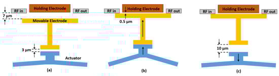 The switching mechanism and steps of proposed design are shown in Figure 2. During switching states, the main acting forces are: (1) thermal expansion force, (2) spring force, and (3) electrostatic force. In the initial step (see Figure 2a), a large air gap of 7 µm exists between the RF signal line and the switching electrode (slider) to make the switch in OFF state with good isolation. Then electrical current follows through the V-shaped electrothermal actuator, thermal expansion force pushes the slider to close the air gap and contact with the transmission line, shifting the switch into ON state (see Figure 2b). Next, the voltage applied to the holding electrode generates electrostatic force between fixed electrode and movable electrode. The electrostatic force is sufficiently high to hold the switch in ON state, so the applied current in the thermal actuator can be removed to reduce the power consumption (see Figure 2c). The switch can finally return to its initial position (OFF state) by the spring’s restoring force when the applied voltage on holding electrode is removed. In the whole operation, the electrostatic force is only operated during the electrostatic latching when the gap between fixed electrode and moving electrode is very small (500 nm), therefore the switch requires low operating voltage. In addition, electro-thermal force is only needed for a short period during switching states to move the movable electrode to touch the fixed electrode, thus the ON state does not consume power. Therefore, the proposed design can be implemented in the applications where both low actuation voltage and low power consumption are required.