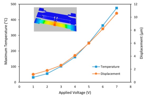 The simulated maximum temperature and displacement of the electrothermal actuator with various applied actuation voltages.