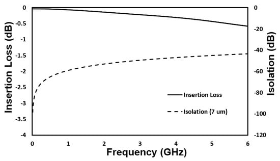 To investigate and optimize the RF performance of the proposed switch, the finite integration technology has been utilized in CST Microwave Studio. The coplanar waveguide (CPW) transmission line is set as gap/width/gap (G/W/G) of 55/100/55 µm for a 50 Ω impedance. The simulated results show very low insertion loss of −0.58 dB in ON state and very high isolation of −43.47 dB in OFF state at 6 GHz, as shown in Figure 5.
