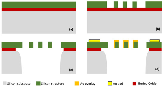 Fabrication process flow including four key steps: (a) starting SOI wafer, (b) Si structure patterning by deep reactive ion etched (DRIE), (c) Structure releasing by backside DRIE dry etching and wet etching, and (d) Metal layers deposition for connection and overcoating.