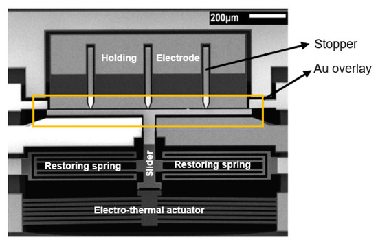 Scanning Electron Microscopy (SEM) photo of the fabricated switch. Au overlay is added to reduce the contact resistance and RF signal loss. Three stoppers ensure no contact and short circuit between movable electrode and holding electrode.