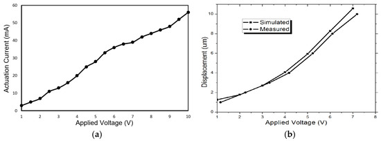 (a) Measured I–V characteristics of the fabricated V-shaped electrothermal actuator. (b) Comparison between simulation and measured displacements vs. applied actuation voltages.