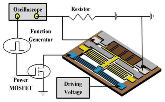 To achieve high isolation, large separation gap in OFF state is needed in RF transmission line. Currently, electrothermal and electrostatic actuators are widely used to generate large separation displacement in MEMS switches. Electrothermally actuated devices have simple fabrication processes, require lower actuation voltage, and are suitable for an application which demands higher contact force [6,7]. However, electrothermal actuation consumes high power which limits it from some applications where devices need to maintain ON position for a significant period of time [8]. By contrast, electrostatic actuated devices consume nearly zero low power as no DC current is needed during the actuation process. However, electrostatic based devices are limited by the trade-off between operating voltages and mechanical properties of the device [9]. For example, the operating voltage required is limited by the available voltage on the device in the whole RF system, which may be typically low (e.g., 5 V). However, high operating voltage, typically more than 50 V is required to reduce the parasitic load of the RF signal line, avoid a self-latching, and have a large mechanical separation between input and output ports.