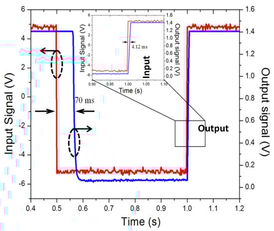 Figure 10 illustrates the measurement set-up schematic for measuring the switching times. As the switching drive signal, a 1 Hz square wave voltage signal (5 Vpp and 50% duty cycle) is supplied by a function generator. A power MOSFET is used to separate the input control signal from the switch driving voltage signal. The driving voltage is supplied with a constant power supply of 1.5 V. One port of switch is grounded and the other port is connected to an oscilloscope to monitor the transient switching times. Figure 11 plots the measured switching times of the fabricated switch. The switch has shown a response time of 70 ms for the transition from open state to close state, and a releasing time of 4.12 ms for the transition from close state to open state. The measured response time is much longer than the releasing time. This is due to the fact that the movable electrode needs to travel a total distance of 10 µm before contacting the broken signal line, whereas the disconnection of the switch only needs to separate the movable beam from signal lines by removing the applied drive voltage. It should be noted that the switching speed of the electrothermal actuator is slower compared to that of its electrostatic counterparts. The reason is that electrothermal actuator generates its movement through Joule heating effect, which is inherently slower than electrostatic effect.