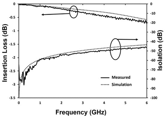 Comparison between the measured and simulated RF performances (Insertion Loss and Isolation) of the fabricated switch.
