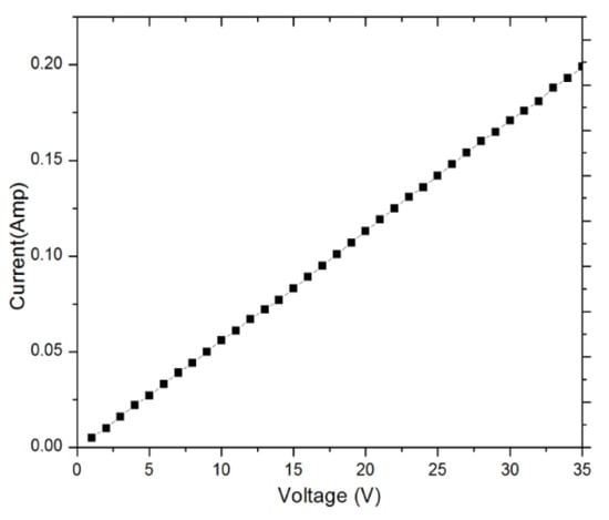 The contact reliability of the fabricated switch in terms of switching cycles under high voltage is also investigated [28]. The test is conducted in air ambient and hot switching condition with high applied voltage from a dc power supply across a resistive load. The applied voltage is continuously increased in steps of 1V until the contact survives. The fabricated switch can handle hot switching up to 35 V and 0.2 A across a 100 Ω resistor as shown in Figure 14. When voltage is further increased, the switch failed in open state and contact resistance jumps to several mega-ohms. The mechanisms of failure include deterioration of contact surface and deformation of silicon beams. The other possibility of switch failure could be airborne contamination as the measurement was conducted under atmospheric conditions without hermetic packaging. The reliability of the switch can be improved by using hard materials such as Platinum (Pt) and Ruthenium (Ru) instead of commonly used Au-to-Au contact [29,30,31]. Another way to increase the power handling capability is to reduce the current through each contact by implementing multiple contacts in the switch [32,33,34]. In addition, hermetic packaging can also improve the switch reliability for its protection from humidity and contamination.