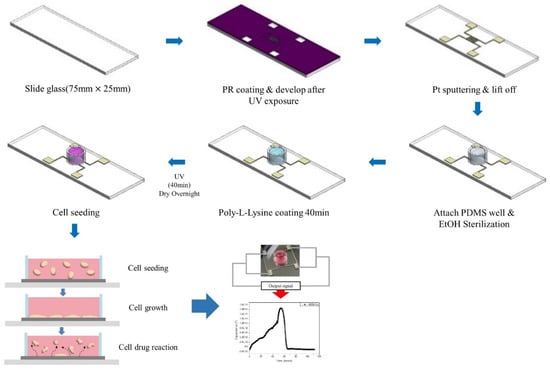 The manufacturing processes of the sensor is shown in Figure 1. Sensors are manufactured on glass slides to allow cells to be observed by a microscope. First, the glass slide was cleaned, and then the process was carried out to produce capacitive biosensor patterns on top. At this time, the photolithography process was carried out for a more precise pattern process. The photoresist was coated with a spin coater at 5000 rpm for about 35 s and baked on a hot plate. Then, the Mask Alignment System (EVG 610) was used to align the pattern mask and exposed for 8.3 s. After that, the AZ 300 MIF developer was used to develop the sample and remove the photoresist of the pattern. RF/DC magnetron sputter equipment was used to deposit electrode patterns. In order to facilitate adhesion between the slide glass and Pt patterns, 5 nm of Cr was deposited and 80 nm of Pt was deposited. After the deposition was completed, the lift off process was carried out on the sample to leave only the pattern. Annealing was performed to make the electrode connection stronger, and the PDMS well was attached over the capacitive biosensor pattern to create a space for the cells to grow.