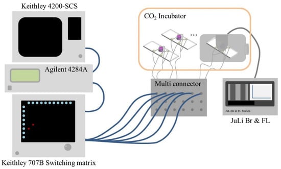 Using biosensors manufactured using the above method, the capacitance of cells was measured as a function of frequency and the capacitance of cells at a particular frequency. Measurements were made using Keithley 4200-SCS, Agilent 4284A, and Keithley 707B Switching Matrix, and microscopic images were observed using NanoEnTek′s live cell movie analyzer (JuLITM Br & FL, Waltham, MA, USA). The measuring process is shown in Figure 2.