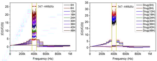 Puromycin is also a drug that causes apoptosis [,]. Looking at the mechanisms of the cells when apoptosis occurs, when puromycin is injected into the cells, the cells react with drugs for a certain period of time, resulting in various interior reaction before the cell death []. By measuring cells using the above principles, the capacitance of the cells according to frequency sweep was identified, and the frequency at which NIH 3T3 cells most sensitively represented cell changes was 367 to 440 kHz. The results are shown in Figure 3.