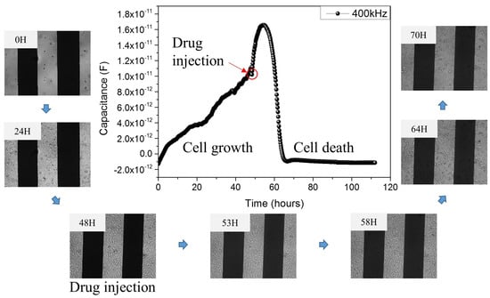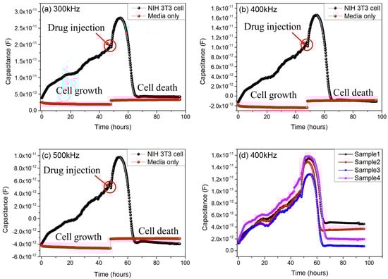 As a result, when checking the capacitance of cells, the most reliable frequency is determined as 400 kHz, and we checked the results together up to 300 and 500 kHz, simultaneously. Figure 4 shows the measured results of 300, 400 and 500 kHz, respectively. The capacitance–time graph shows that the capacitance value increases from 0 to 48 h. After the drug’s injection into the well, the capacitance value decreases after about 7–8 h. The red colored data in the graphs in Figure 4a–c show media-only capacitance data for comparison, and there are no remarkable changes in media-only cases. These results were compared with microscopic images from cell growth and death cases. The graph in Figure 4d shows the reproducibility of the experiment. In the four samples shown in this graph, differences in capacitance values appear as cell growth and death differ for each sample. However, it can be seen that the overall shape of the graph is consistent.