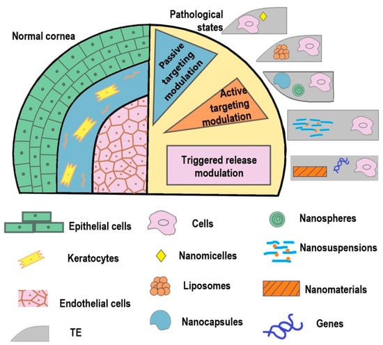 Nanotechnologies can be used at the stage of corneal scaffold fabrication to improve their physicochemical properties, but also after scaffold implantation, for example to deliver various therapeutic agents by means of nanocarriers in order to solve the problems of inflammation, secondary infections, and neovascularization in the damaged area.