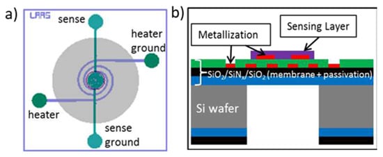 More specifically, microsensors based on microhotplates composed of hanging membranes with sensing electrodes and heating elements have proven its high application to various gas-sensitive elements with low power consumption [,,]. This kind of platform (Figure 1) is compatible with various technics of sensing layer integration, such as inkjet printing or microplotter printing [,], screen-printing [,] or magnetron sputtering [].