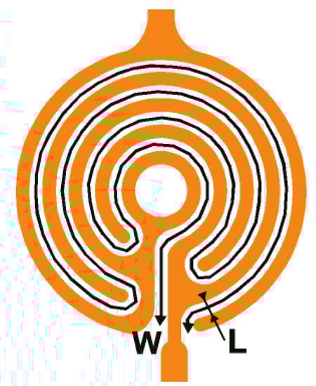 Concerning the sensing electrodes, we can find few different shapes that are usually suited to the sensitive material resistivity. Some can be a miniaturized pair of electrodes with few microns as a gap [] or interdigitated electrodes, as an example: the comb shaped sensing electrodes given in Figure 2 [] with tight interdigitated electrodes. The gap between the two electrodes is L = 10 µm, and the probed length W = 1620 µm gives a number of square n□ = L/W of 6.2 × 10−3□, and a sheet resistance (R□) in a range from 10 kΩ/□ to 10 GΩ/□. If we consider the thickness range of the sensing layer (around 100 nm), we can calculate the range of resistivity that suits this platform. In this case, we have the possibility to measure materials with a resistivity from 0.1 Ω·cm to100 kΩ·cm. To be able to characterize materials with higher resistivity, which is usual for various metal oxides (MOX), it could be interesting to significantly reduce the gap L between the two electrodes.