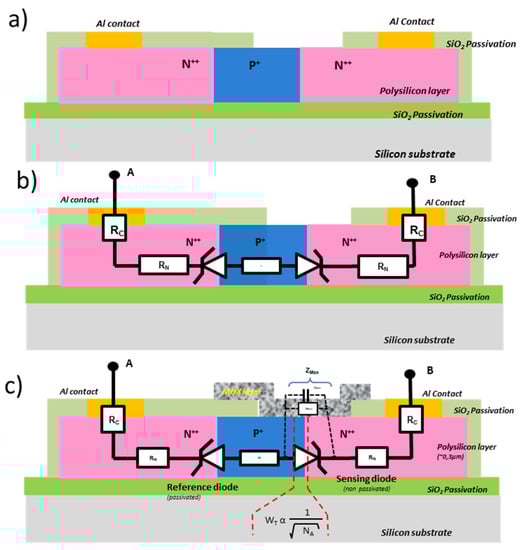 As can be seen hereafter, it consists of a simple technological process flow that can be summarized in only three photolithography steps. From initial p-type polysilicon layer, by locally doping this polysilicon (to become a n-type region), we obtain a double junction that is head-to-tail (Figure 3b). When one is in forward conduction (VD), the other will be in reverse bias; thus, in Zener conduction (VZ), the overall conduction will be driven by the diode in reverse conduction. Due to an insulated SiO2 layer opened above only one junction, we can define a reference diode (covered by SiO2) and a sensing diode (covered at the end by a metal oxide layer) (Figure 3c).
