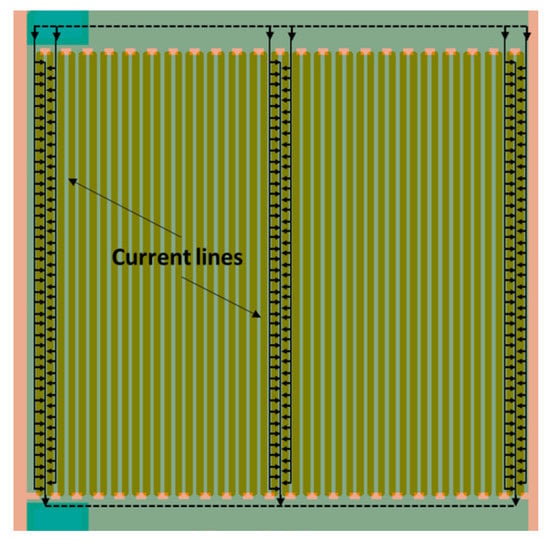 In order to obtain better sensitivity and a large working area, we designed a diode array (matrix) (2 × 2 mm2), keeping the head-to-tail facing diode configuration (Figure 4). This first operational platform has a total working length of W = 6.6 cm and a gap of L = 0.5 µm, which gives a ratio of L/W = 7.6 × 10−6□ and thus a sheet resistance R□ in the range of 130 MΩ/□ to 13 TΩ/□ corresponding to sensitive MOx resistivity from 10 kΩ·cm to 1 GΩ·cm. This is large compared with standard interdigitated electrodes on microhotplate platforms. Thus, this platform is well adapted for high-resistive materials.