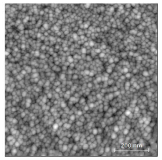 The AFM observation shows a surface with well-defined circular grain and intergranular porosity (see Figure 5). Using image analysis [], the mean grain size is centered on 4.8 nm with an error of 0.1 nm, and the measured roughness for this sample is 1.1 nm. This is excellent for interactions with gas molecules. This morphology is typical of a sputtering deposition and is well known from previous studies [].
