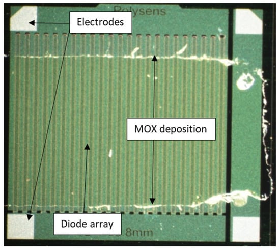 This gas-sensitive layer was deposited onto the platform using RF magnetron sputtering through polymer shadow mask, with the correct opening above the diodes. The shadow mask (in kapton) was stuck on the surface of the device, exposing the right area to deposit, and was then removed after deposition. First prototypes were obtained (Figure 6), and the chips were mounted in a TO-8 package with the electrodes, and the package was connected with wedge bonding using 25 µm aluminum wires.
