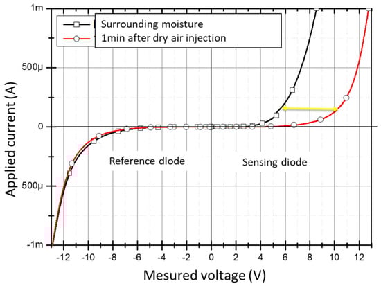 Figure 8 shows the I-V characteristics of the reference diode and the sensing diode under ambient atmosphere (with 50% of relative humidity) and then under dry air flow in the probe station chamber.