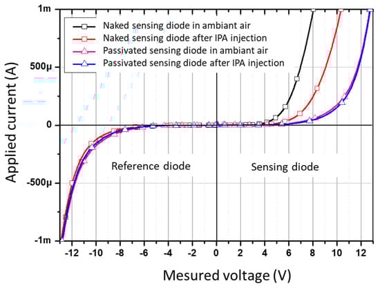 Figure 9 shows the characteristics of the two sets. The passivated one showed a classical Zener diode behavior, and the naked sensing diode showed different responses to the ambient air and under IPA, proving again, the concept of gas detection due to the naked P-N junction compared with the passivated one.