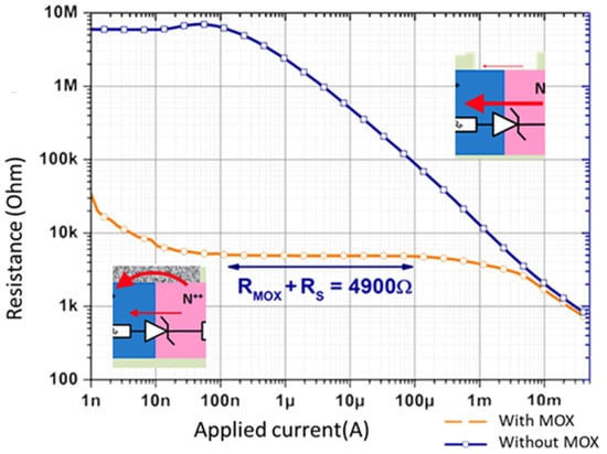 In this final preliminary test, we wanted to compare the sensing diodes I-V characteristics with and without the MOX sensitive layer. It is obvious (i.e., Figure 10) that the reverse current flow passed through the P–N junction without MOX, revealing high resistance. When the MOX layer is present, the equivalent resistance is significatively lower at low current (100 nA), which proves that the reverse current in the Zener diode is well shunted by the current in the MOX. This is precisely what we wanted.