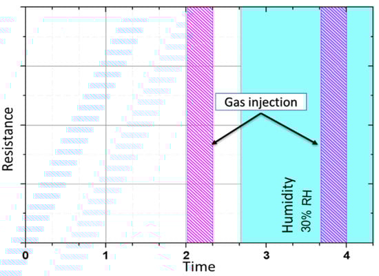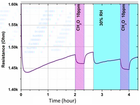 For the static test, dry air was continuously injected into the 250 cc quartz chamber, and after two hours, 10 ppm of formaldehyde was injected during 30 min. In a second part, humid air (with 30% relative humidity) was continuously injected, and after 1.5 h, 10 ppm of formaldehyde was again injected into the humid air. The total flow rate was continuously maintained at 200 cc/min. First, the static response of the sensor consisted of measuring the overall resistance when a 1 mA reverse current was injected into the sensing diodes (Figure 11).