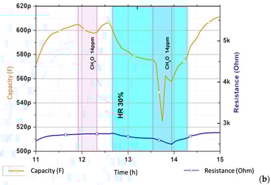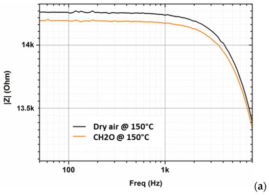 Figure 13a,b shows the results of the dynamic tests. There is a shift to lower values of impedance when injecting target gas at low frequencies, confirming the results of the static test, and at higher frequencies (at 10 kHz). Although the real part (resistance) reveals small variations, the imaginary part (capacitance) is significantly affected by gas and humidity.