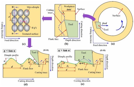 Illustration of the surface texturing process by 1D UVAT: (a) end face; (b) cutting process; (c) micro-textured surface; (d) dimple profile fabricated under η < tanα; (e) dimple profile fabricated under η > tanα.