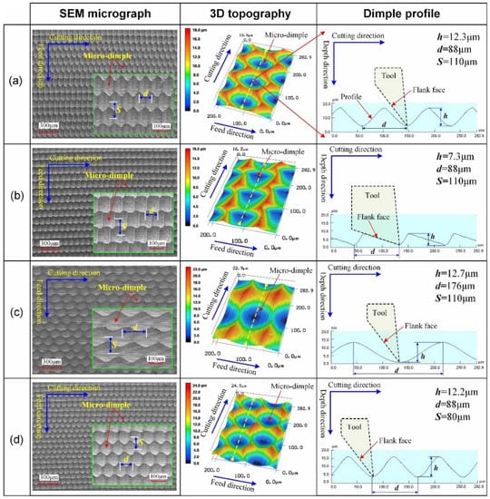 In order to analyze the surface topography, a scanning electron microscope (SUPRA™ 55, Zeiss, Germany) was used to take micrographs, and a laser microscope (VK-X200, Keyence, Japan) was used to observe the 3D topography and dimple profile. The detailed SEM micrograph, 3D topography, and dimple profile of the four micro-textured surfaces are shown in Figure 4. It can be found that all the micro-textured surfaces were covered with continuous dimples, and then, they can also be called the micro-dimpled surface. Surfaces #1, #3, and #4 were processed under the condition of η < tanα, and surface #2 was processed under the condition of η > tanα. The dimple shape of surfaces #1, #3, and #4 is oval-like, and the corresponding dimple profiles all present a sinusoidal curve. Different from the above three surfaces, the dimple shape of surface #2 is scale-like, and an angle φ exists in the dimple profile due to the existence of an intersection between the cutting trace and flank face. For surface #1, the values of h, d, and S are respectively 12.3 μm, 88 μm, and 110 μm. Surface #2 has a smaller dimple depth compared with surface #1, and the corresponding values of h, d, and S are respectively 7.3 μm, 88 μm, and 110 μm. For surface #3, it has a larger distance between two adjacent micro-dimples in the cutting direction compared with surface #1, and the corresponding values of h, d, and S are respectively 12.7 μm, 176 μm, and 110 μm. For surface #4, it has a smaller distance between two adjacent micro-dimples in the feed direction compared with the surface #1, and the corresponding values of h, d, and S are respectively 12.2 μm, 88 μm, and 80 μm. As for the number of micro-dimples per unit area, the number for surface #3 is the smallest, the number for surface #4 is the largest, and the number for surface #1 is equal to that of surface #2. The corresponding main parameters of micro-dimples on the surfaces are summarized in Table 2.