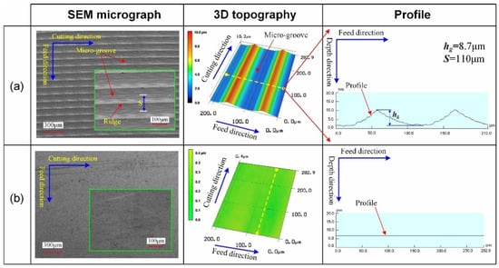 The detailed SEM micrograph, 3D topography, and profile of surfaces #5 and #6 can be seen in Figure 5. For surface #5, it is found that the micro-grooves are evenly distributed on the surface. Therefore, surface #5 is also called a micro-grooved surface. The distance between two adjacent micro-grooves in the feed direction is 110 μm, and the depth of the micro-groove (hg) is measured to be 8.7 μm.