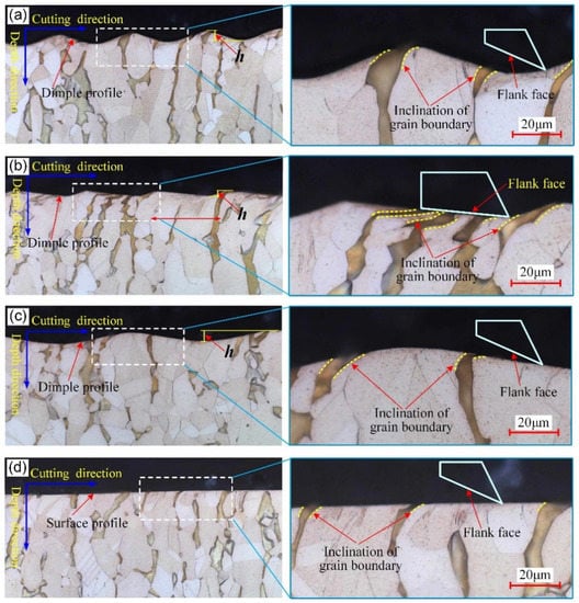 From Figure 6, it can be seen that the inclination degree and depth of the grain boundary of micro-textured surfaces #1, #2, and #3 are all greater than those of micro-grooved surface #5. The corresponding inclination direction is all along the cutting direction. For surfaces #1 and #3, the dimple profile corresponding to the subsurface presents a sinusoidal curve, which is same as that of the dimple profile derived from the observed 3D topography. Under the intersection state of η < tanα, the instantaneous extrusion of the surface material by the cutting edge and the shear stress due to friction between the tool and workpiece cause the plastic deformation and shear slip of the subsurface metal grains, resulting in the occurrence of elongation of grain and inclination of the grain boundary during the vibration cutting process, as shown in Figure 6a,c. It confirms that the elastoplastic deformation of the material is real in this surface texturing. This contributes to revealing the phenomenon that the actual dimple depth is larger than the theoretical predicted value of 7.8 μm. When the intersection state is η > tanα, the corresponding subsurface microstructure of surface #2 can be seen in Figure 6b. The dimple profile corresponding to the subsurface is also same with that derived from the observed 3D topography. In particular, both the elongation of grains and inclination of grain boundaries are the most serious compared with those of surfaces #1 and #3. It is further proved that when the flank face intersects with the cutting trace, the instantaneous extrusion from the flank face is greatly enhanced, leading to the enhancement of plastic deformation of the subsurface. This also contributes to revealing the phenomenon that the actual dimple depth is larger than the theoretical predicted value of 6.7 μm.