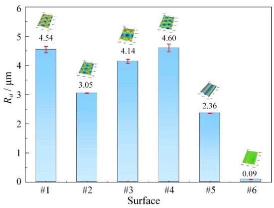 The laser microscope (VK-X200, Keyence, Japan) was used to measure the surface roughness (Ra) for surfaces #1–#6. The corresponding scanning area is the same with the observation area, as shown in Figure 3. Three points were measured on every surface, and the average value was taken as the value of the surface roughness. The measured results of the surface roughness are shown in Figure 7. It can be found that the roughness of the micro-textured surfaces fabricated by 1D UVAT is greater than that of the micro-grooved surface processed by the conventional turning. The roughness from surface #1 to surface #4 is 4.54 μm, 3.05 μm, 4.14 μm, and 4.60 μm, respectively. Among the four micro-textured surfaces, surface #2 with a minimum dimple depth fabricated under the intersection state of η > tanα shows the lowest roughness. For surfaces #1, #3, and #4 fabricated under the intersection state of η < tanα, the differences in the number of micro-dimples per unit area and dimple size also lead to the change of the corresponding surface roughness.