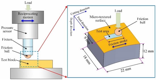 After finishing the surface texturing, a test block on which it is easy to carry out the following surface observation and friction test needs to be cut from the workpiece, as shown in Figure 3. The length, width, and height of the test block are 22 mm, 18 mm, and 12 mm, respectively. For the end face, the size and shape of micro-dimples on different positions in the feed direction can change []. In order to avoid the influence of the end face position on micro-dimples, the observation area of all surfaces is set in the middle of the test block surface (the red box area in Figure 3) and remains unchanged.